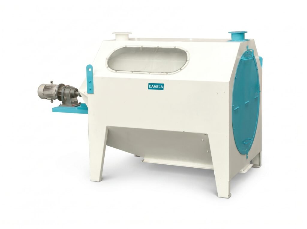 A rotating cylindrical sieve used for cleaning grains by removing large impurities.
